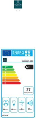 Consommation d'énergie Classe d'efficacité énergétique: A++, Consommation annuelle d'énergie en kWh: 27 kWh, Classe d'efficacité d'évacuation de la vapeur et fumées: A, Classe d'efficacité de l'éclairage: A, Classe d'efficacité de filtration des graisses: D